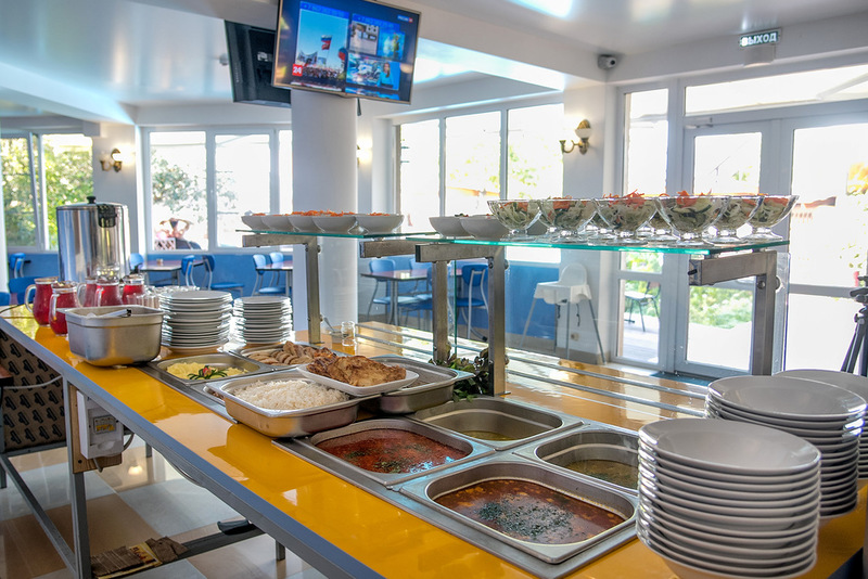 В стоимость проживания включено 3-разовое питание по системе «шведский стол», без привязки по времени. Питание проходит в современной столовой Лаванда в стиле лофт в корпусе №2. На территории 1 корпуса находится гриль - бар «Фрегат» (ресторан-корабль) с 18 метровыми мачтами, палубой с великолепным видом на море. В гриль-баре можно отведать черноморскую рыбу: ставриду, кефаль, барабульку, камбалу, сарган и т.д, выловленную местными рыбаками по минимальным ценам.