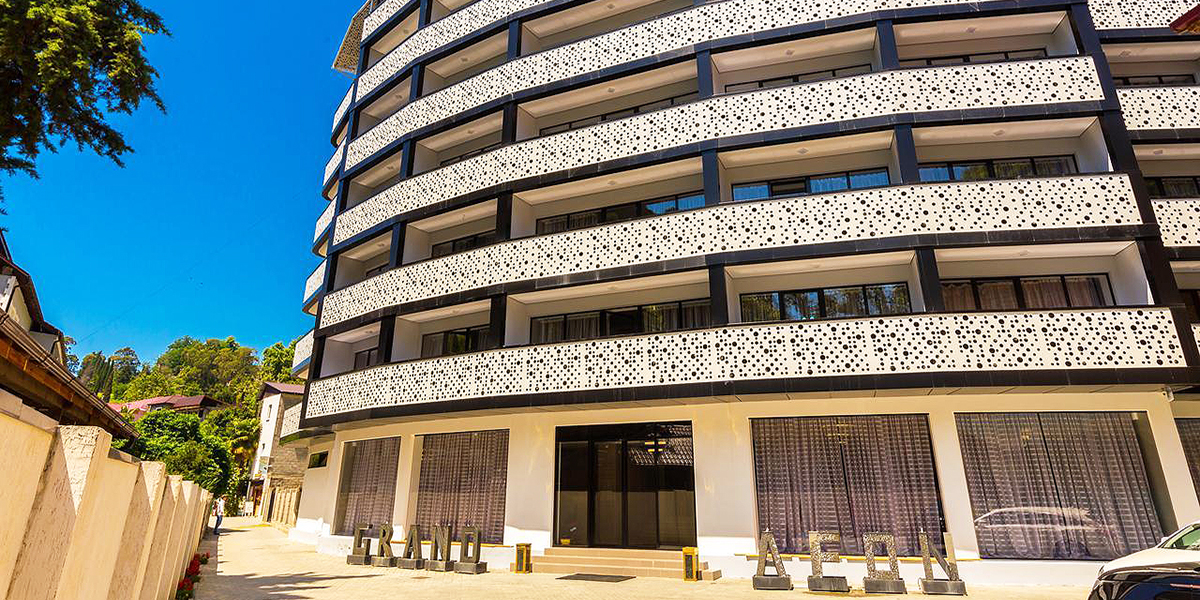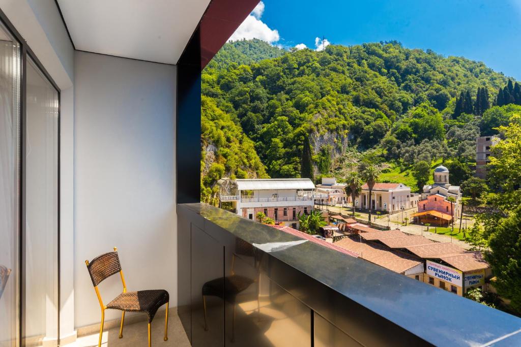 Отель «Гранд Афон» расположен в историческом центре Нового Афона. В шаговой доступности находятся: Лебединое озеро (600 м), озера Рица и Голубое, Ново-Афонские пещеры, грот и монастырь Апостола Симона Канонита, Музей древнего зодчества, рынок сувениров, магазины, рестораны, кафе. Расстояние до российско-абхазской границы составляет 85 км.