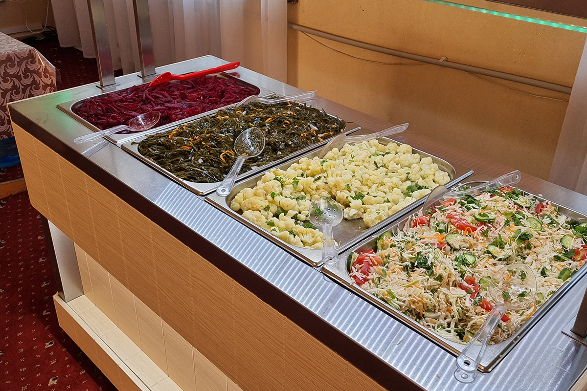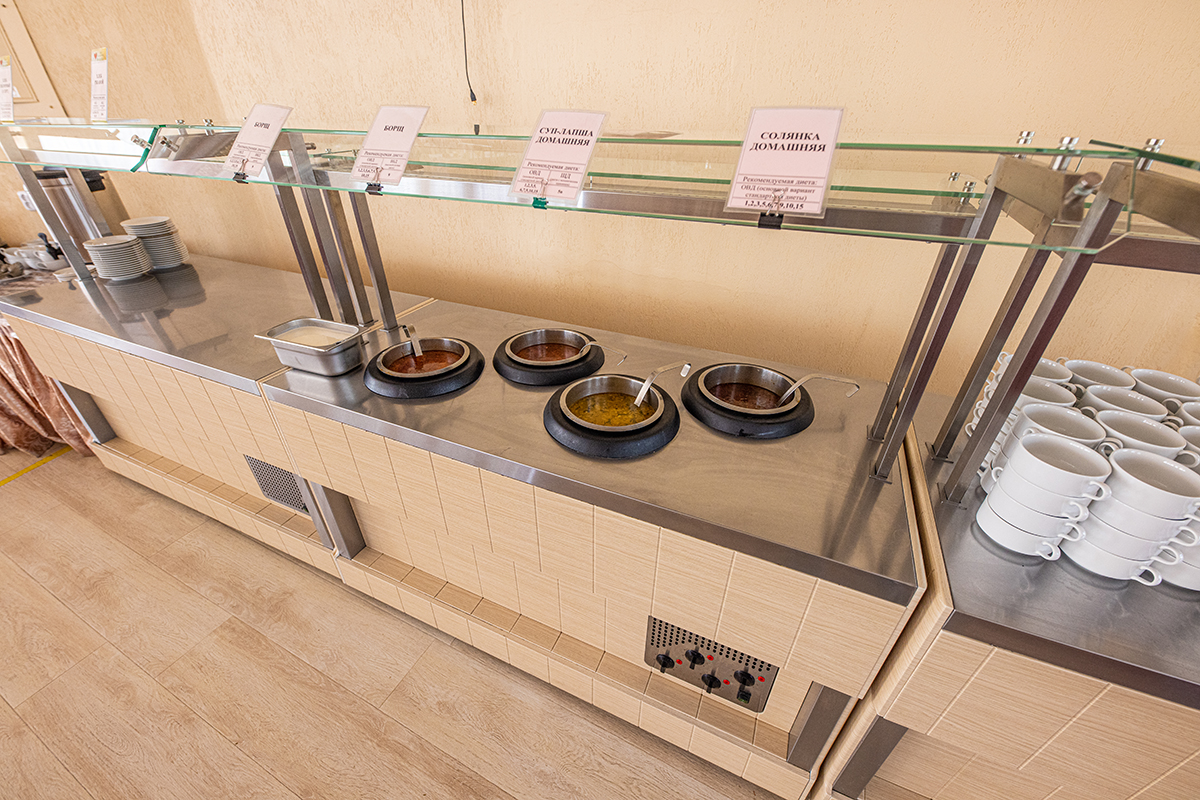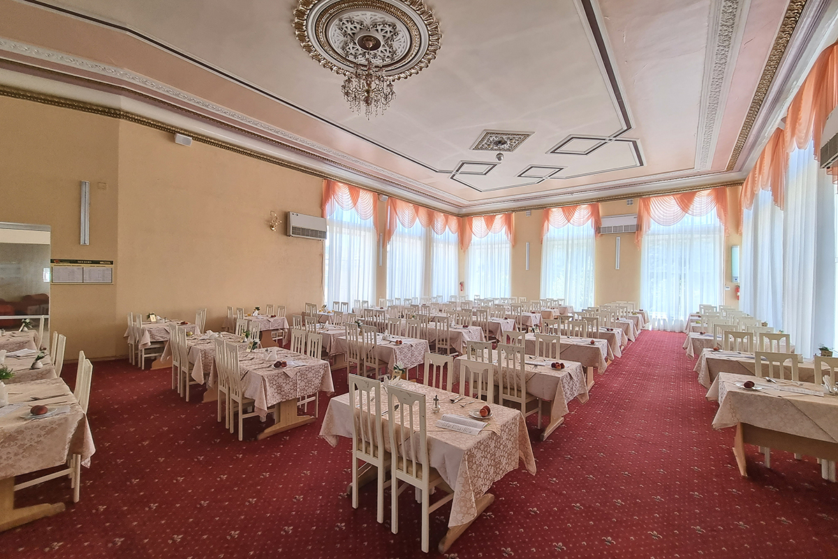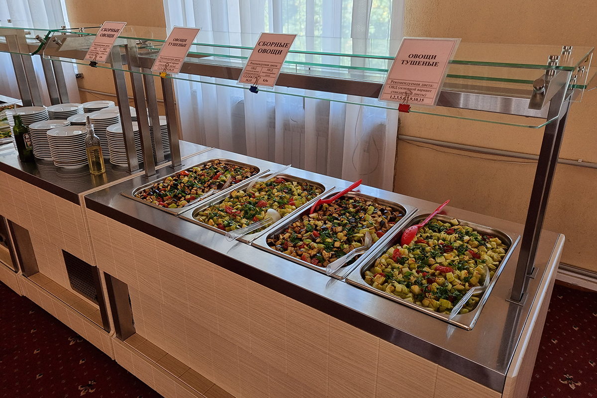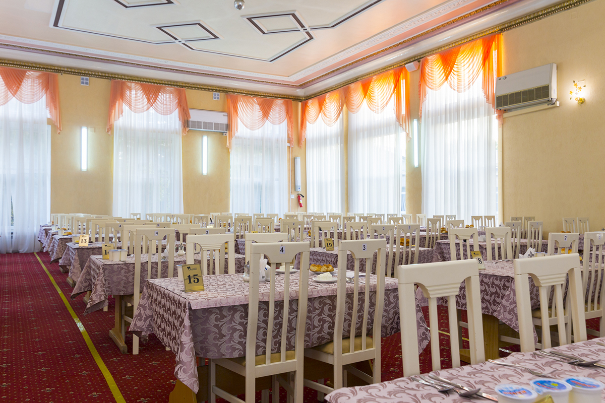 В санатории организовано 3-разовое диетическое питание «меню-заказ». В зале присутствует элемент «шведской» линии - салат-бар. Гости проживающие в номерах повышенной комфортности питаются в отдельном зале. Диеты отдыхающим разрабатываются врачом-диетологом совместно с лечащим врачом и назначаются индивидуально, в соответствии с имеющимися заболеваниями и особенностями здоровья.