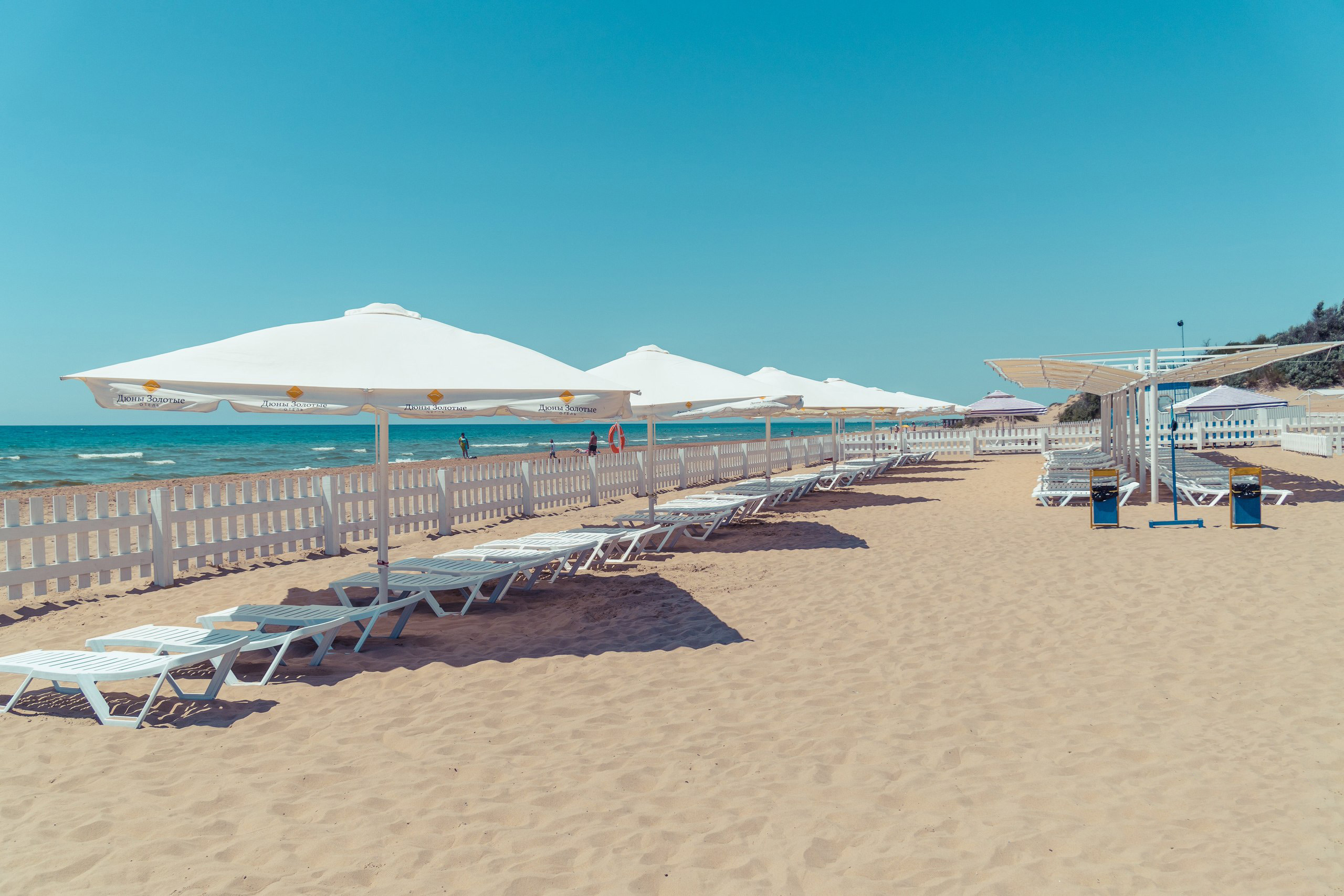 Собственный песчаный пляж находится в шаговой доступности от отеля, в 20 метрах. Пляжный комплекс открыт исключительно для постояльцев отеля и оборудован всем необходимым для комфортного отдыха: шезлонги, теневые навесы и зонтики, душевые кабинки. Для детей организована теневая площадка с аниматорами «Куличики».