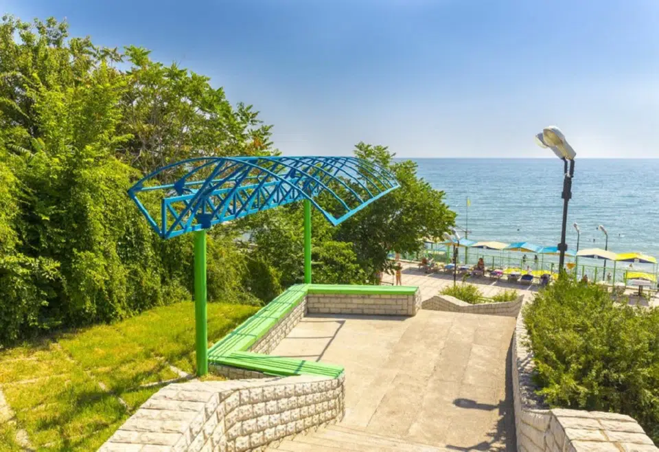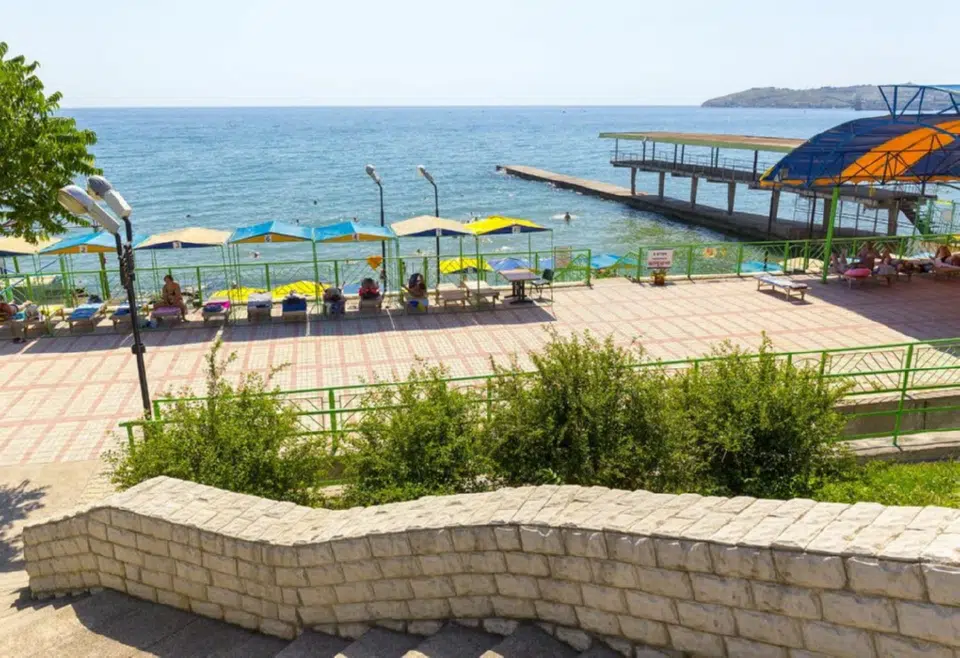 В 100 метрах от пансионата расположен собственный трехуровневый пляж: первый уровень - галечный пляж с деревянными лежаками; второй уровень - палатки (домики) с пластиковыми шезлонгами, туалеты, кабинки для переодевания, душевые, медпункт; третий уровень - палатки (домики) и накрытая площадка с установленными деревянными топчанами, место для курения.