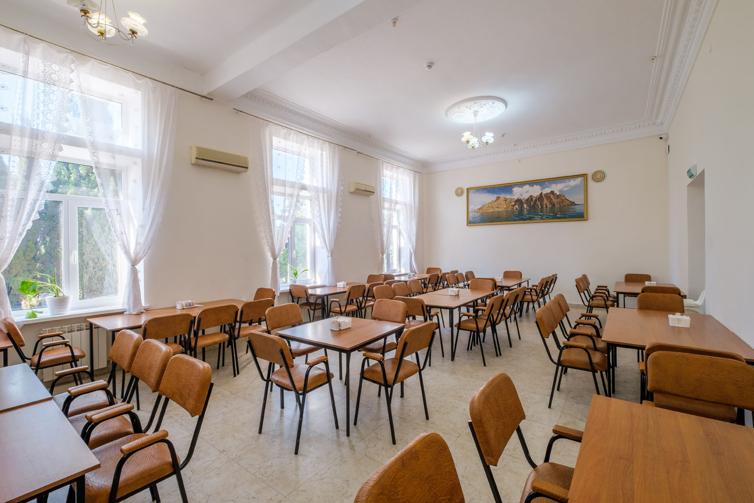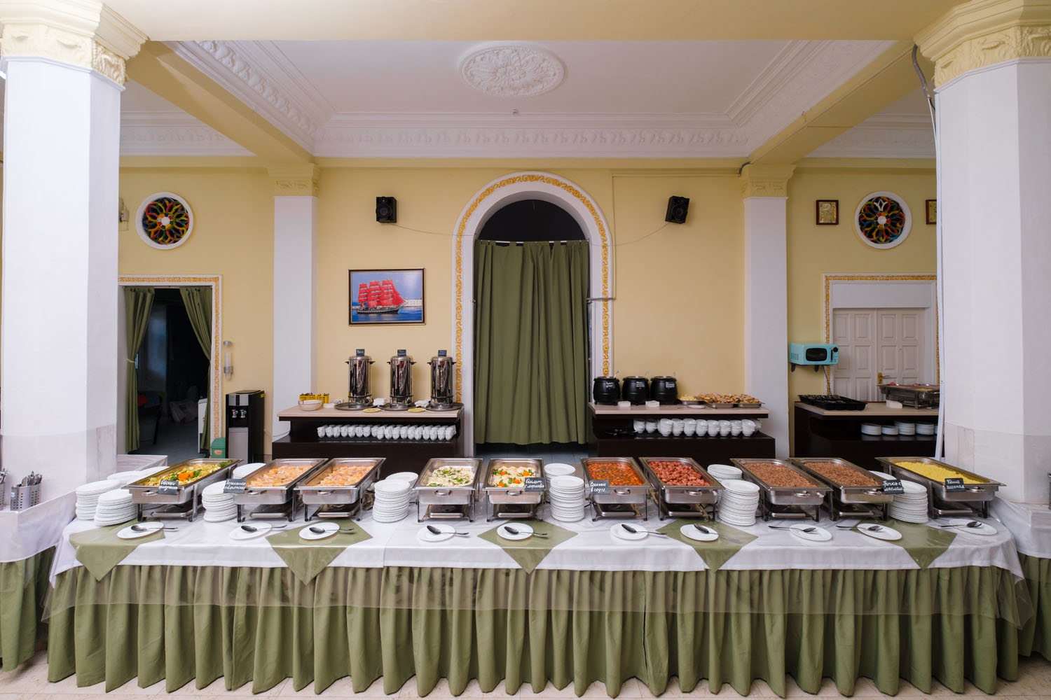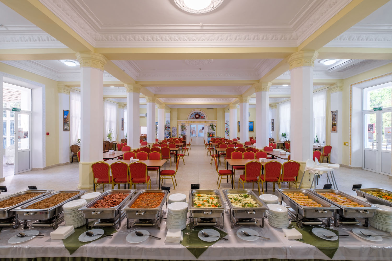 Отель осуществляет обслуживание по системе «Все включено» с 1 июня по 30 сентября. В стоимость проживания входит 3-разовое питание по системе «шведский стол», промежуточное питание в кафе «Синее море»: закуски в ассортименте, слабоалкогольные напитки, пиво, квас, мороженое, сладости. В зале ресторана установлены детские стульчики для кормления.