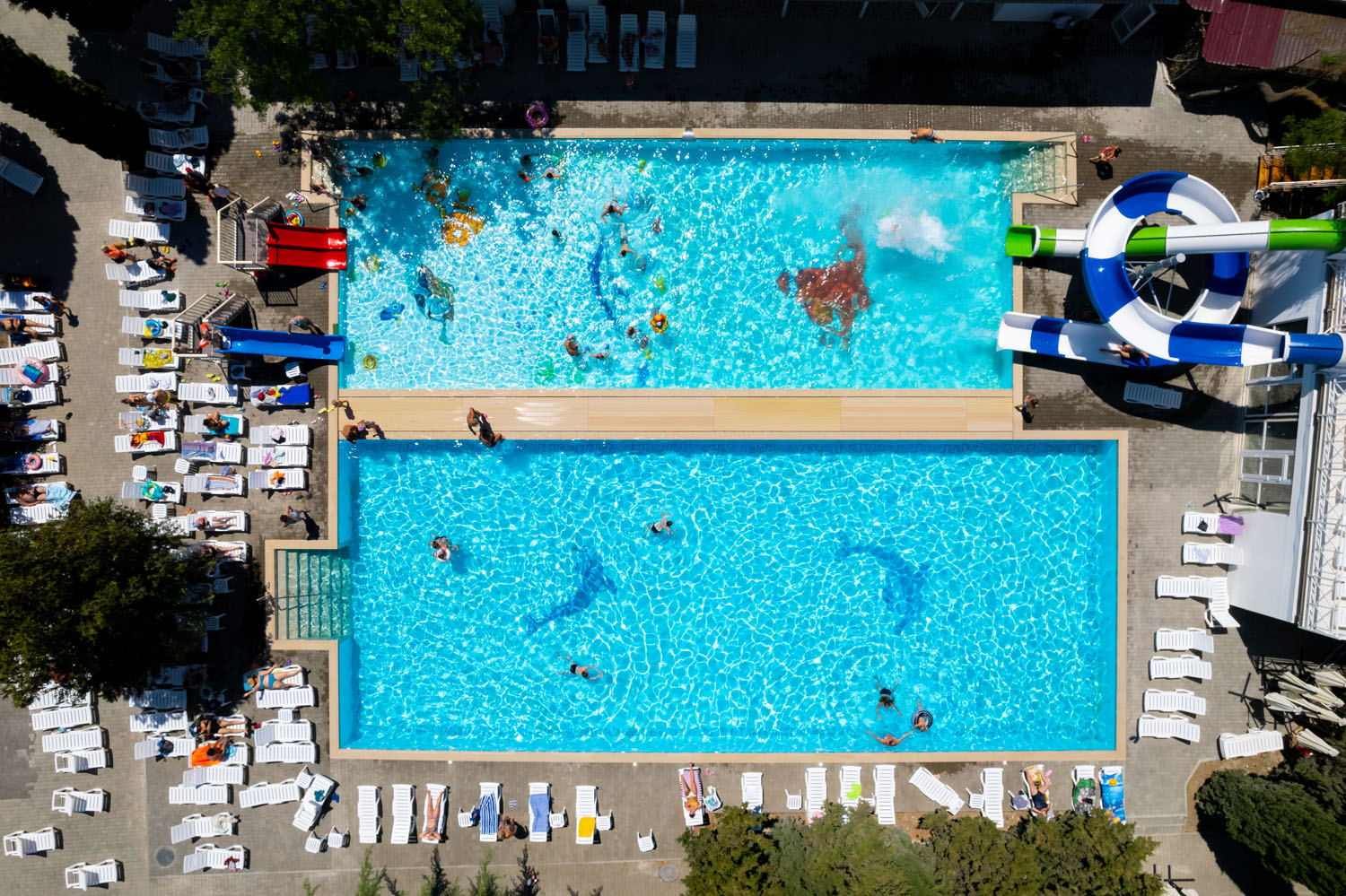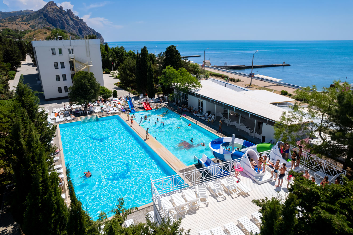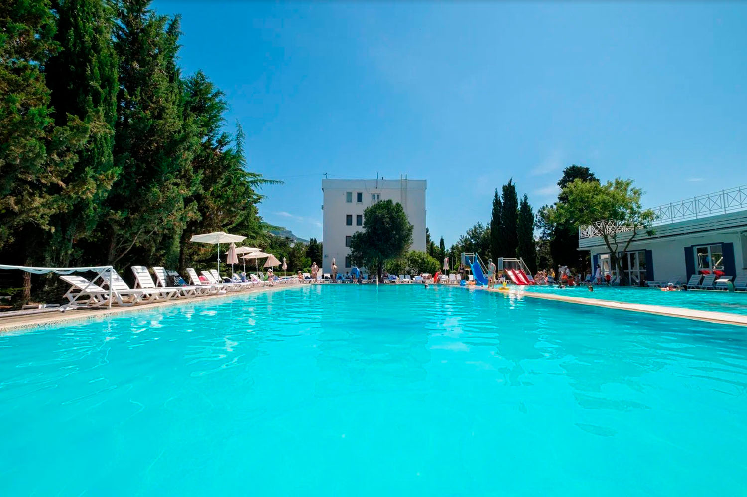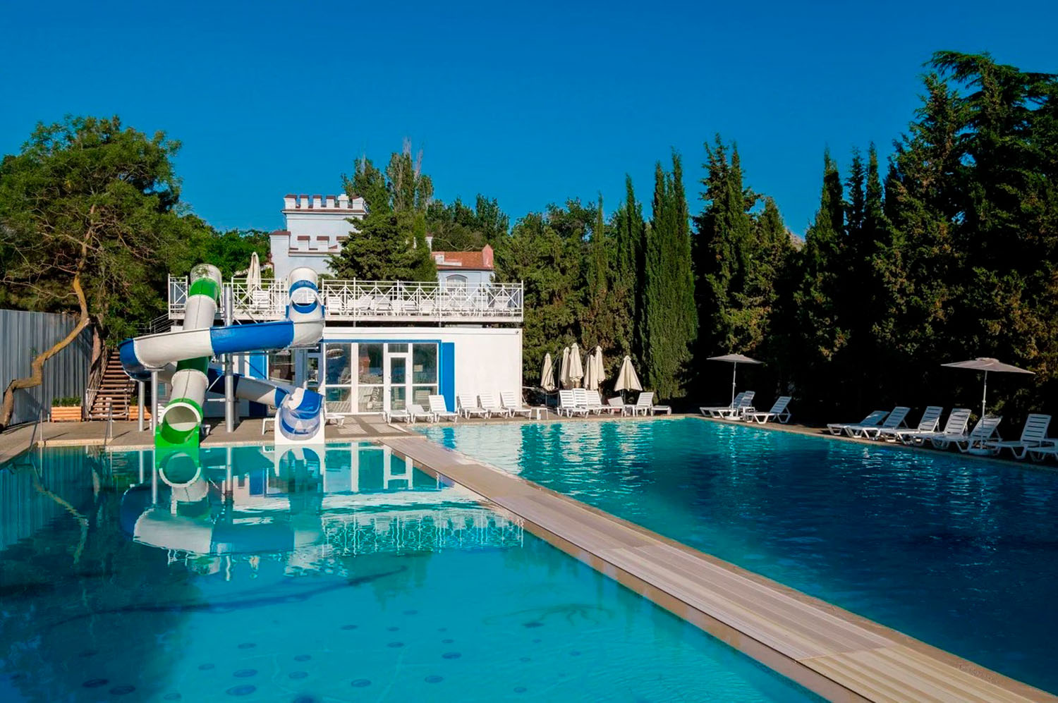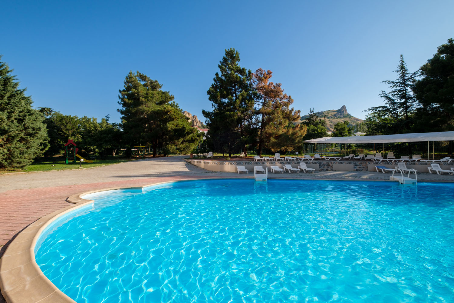 На территории отеля оборудованы два открытых подогреваемых бассейна с пресной водой из артезианской скважины. Площадь первого бассейна составляет 300 кв.м, глубина от 1 до 2 м. Второй бассейн площадью 410 кв.м оснащен двумя водными горками. Имеется отделение для детей. Зоны вокруг бассейнов оборудованы шезлонгами, навесами от солнца, душевыми с туалетами, кабинками для переодевания.