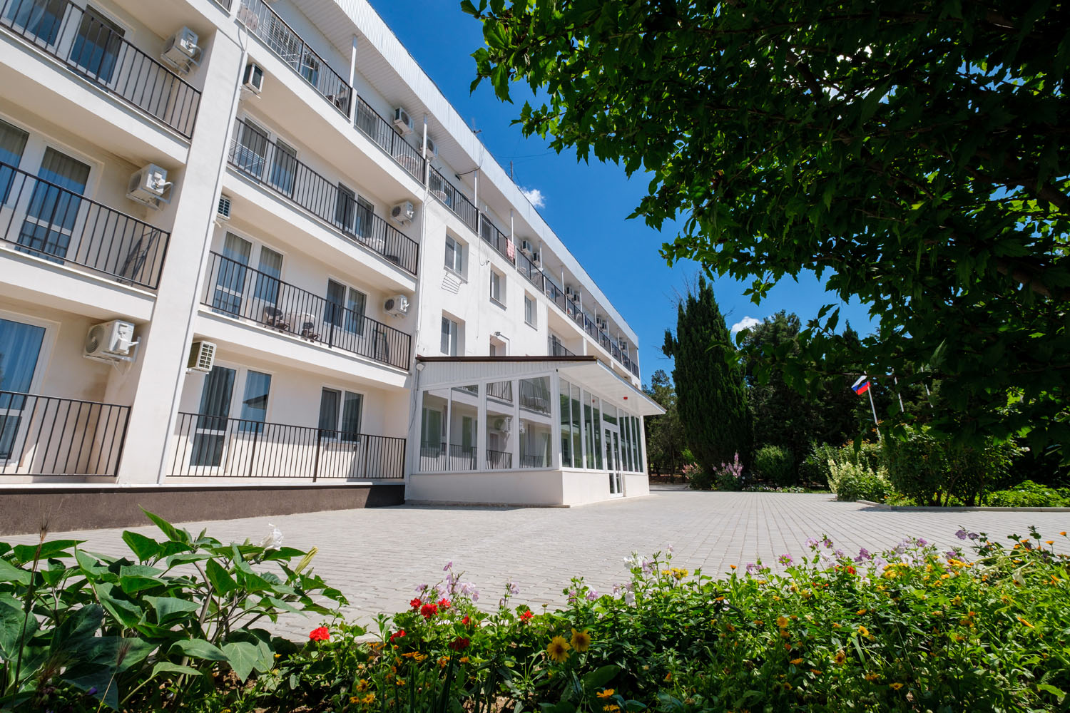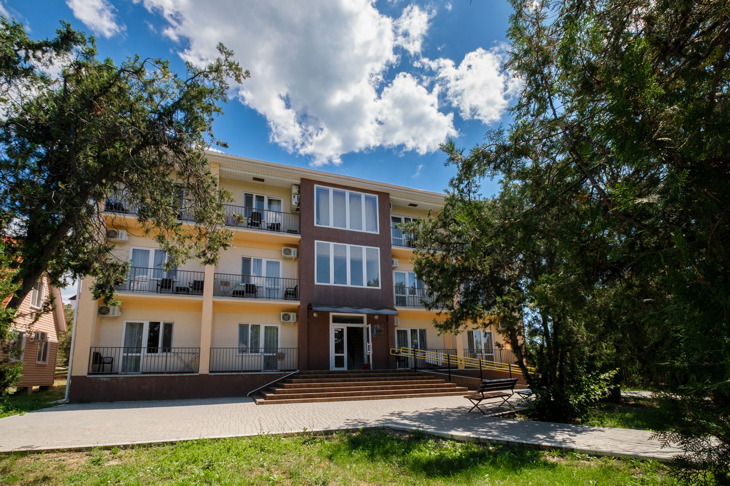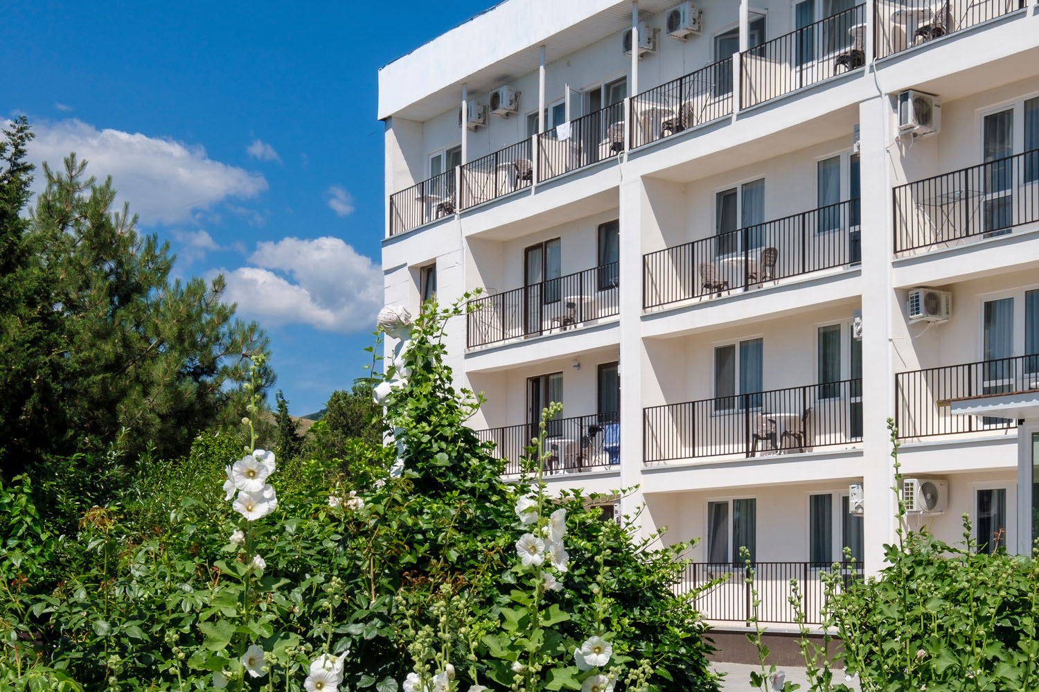 Парк-отель представляет собой комплекс из 4 спальных корпусов, 6 деревянных коттеджей и здания ресторана. Номера оснащены всем необходимым для комфортного проживания: телевизорами, мини-холодильниками, кондиционерами. Корпус №2 - 5-этажный, расположен в парке рядом с бассейном в 200 метров до моря (ресепшн на 1 этаже). Корпус №3 - 4-этажный, в 50 м от моря. Корпуса №№4,5 высотой в 3 и 4 этажа находятся в парке в 150-200 м от моря. Лифты отсутствуют. Двухэтажные деревянные коттеджи-срубы находятся на набережной в 30 метрах от моря.