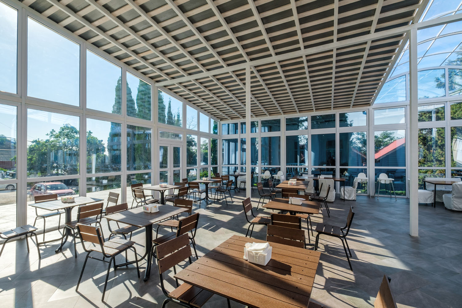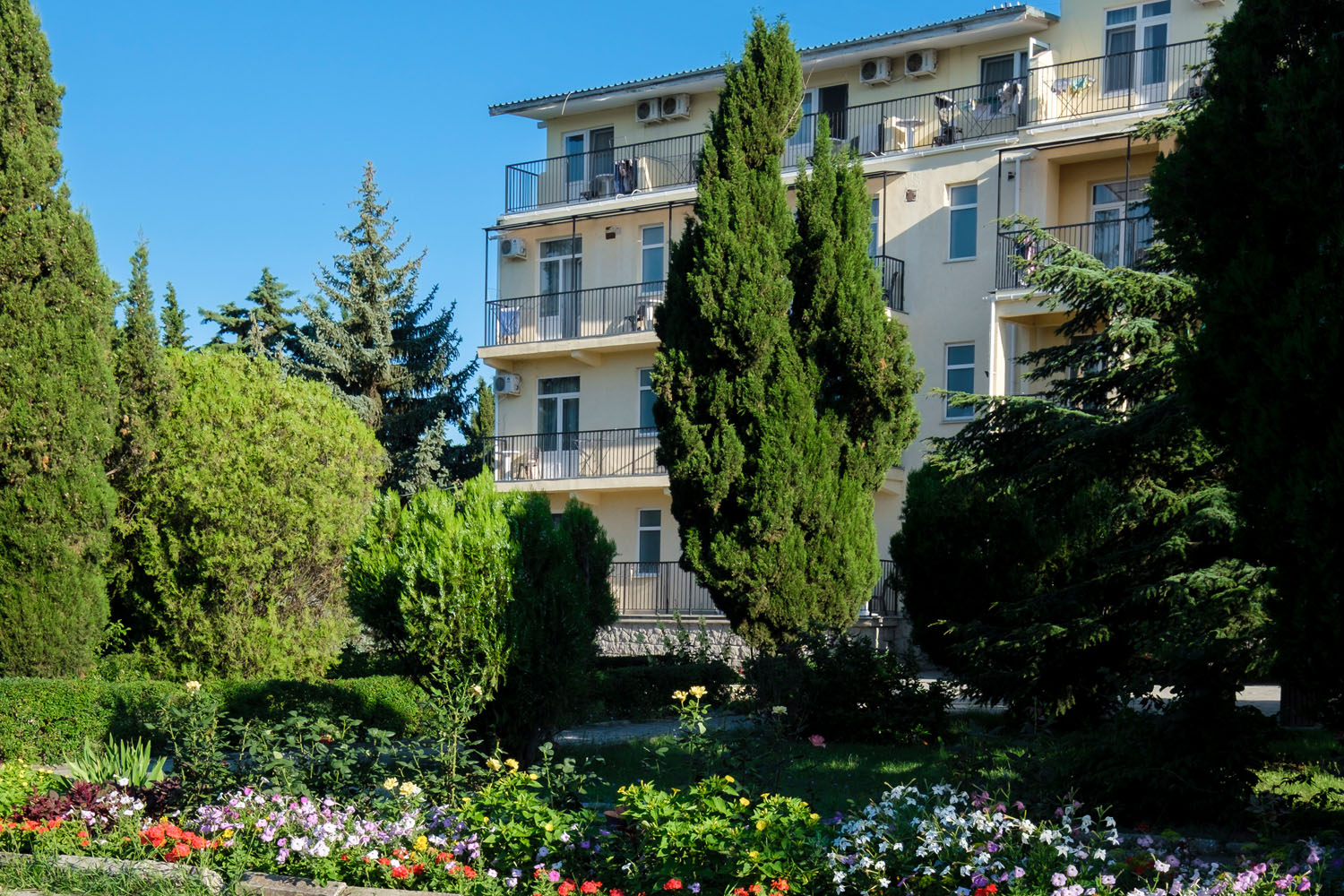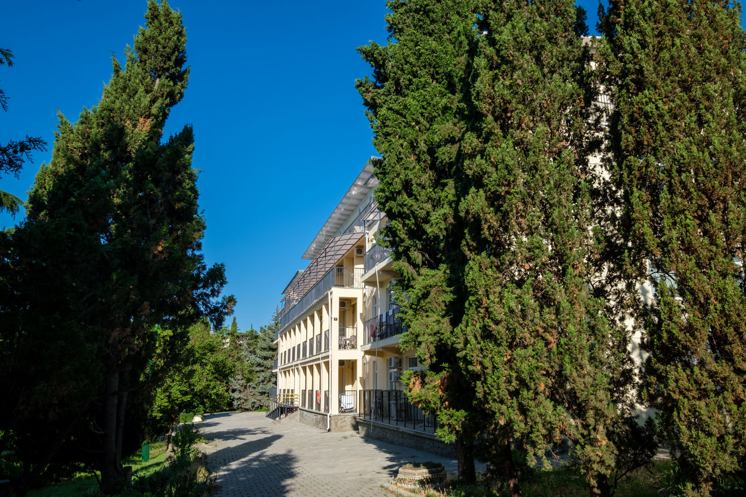 Парк-отель представляет собой комплекс из 4 спальных корпусов, 6 деревянных коттеджей и здания ресторана. Номера оснащены всем необходимым для комфортного проживания: телевизорами, мини-холодильниками, кондиционерами. Корпус №2 - 5-этажный, расположен в парке рядом с бассейном в 200 метров до моря (ресепшн на 1 этаже). Корпус №3 - 4-этажный, в 50 м от моря. Корпуса №№4,5 высотой в 3 и 4 этажа находятся в парке в 150-200 м от моря. Лифты отсутствуют. Двухэтажные деревянные коттеджи-срубы находятся на набережной в 30 метрах от моря.