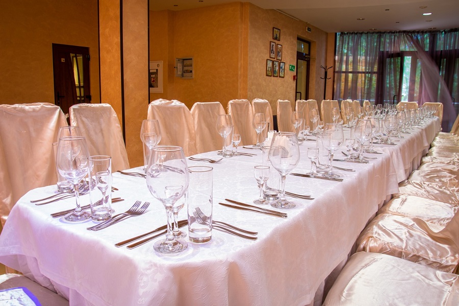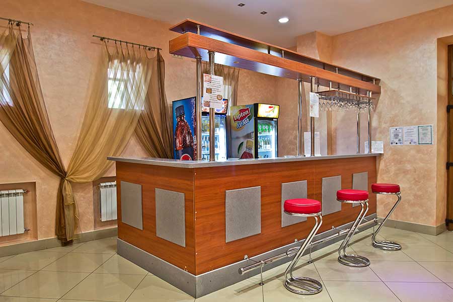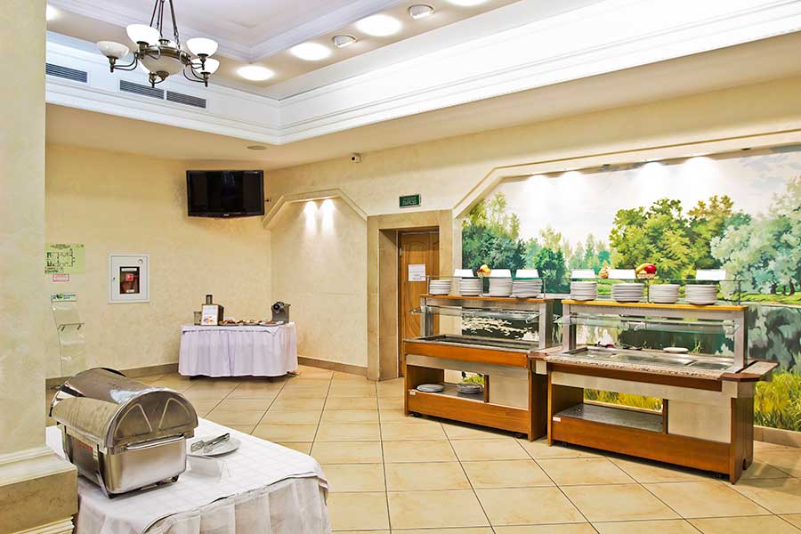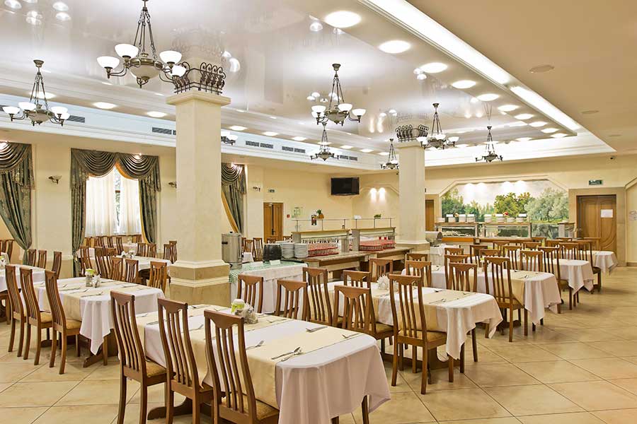 В стоимость проживания включено 3-разовое питание по заказному меню, организованное в отдельно стоящем здании ресторана. Для диетического стола предоставляется дробное 5-разовое питание. Банкетный зал, вместимостью до 180 человек, предлагает проведение банкетов, фуршетов, юбилеев, свадеб, корпоративов. В аквапарке работает бар, предлагающий прохладительные напитки, выпечку, снеки, мороженое. На территории оборудована зона барбекю.